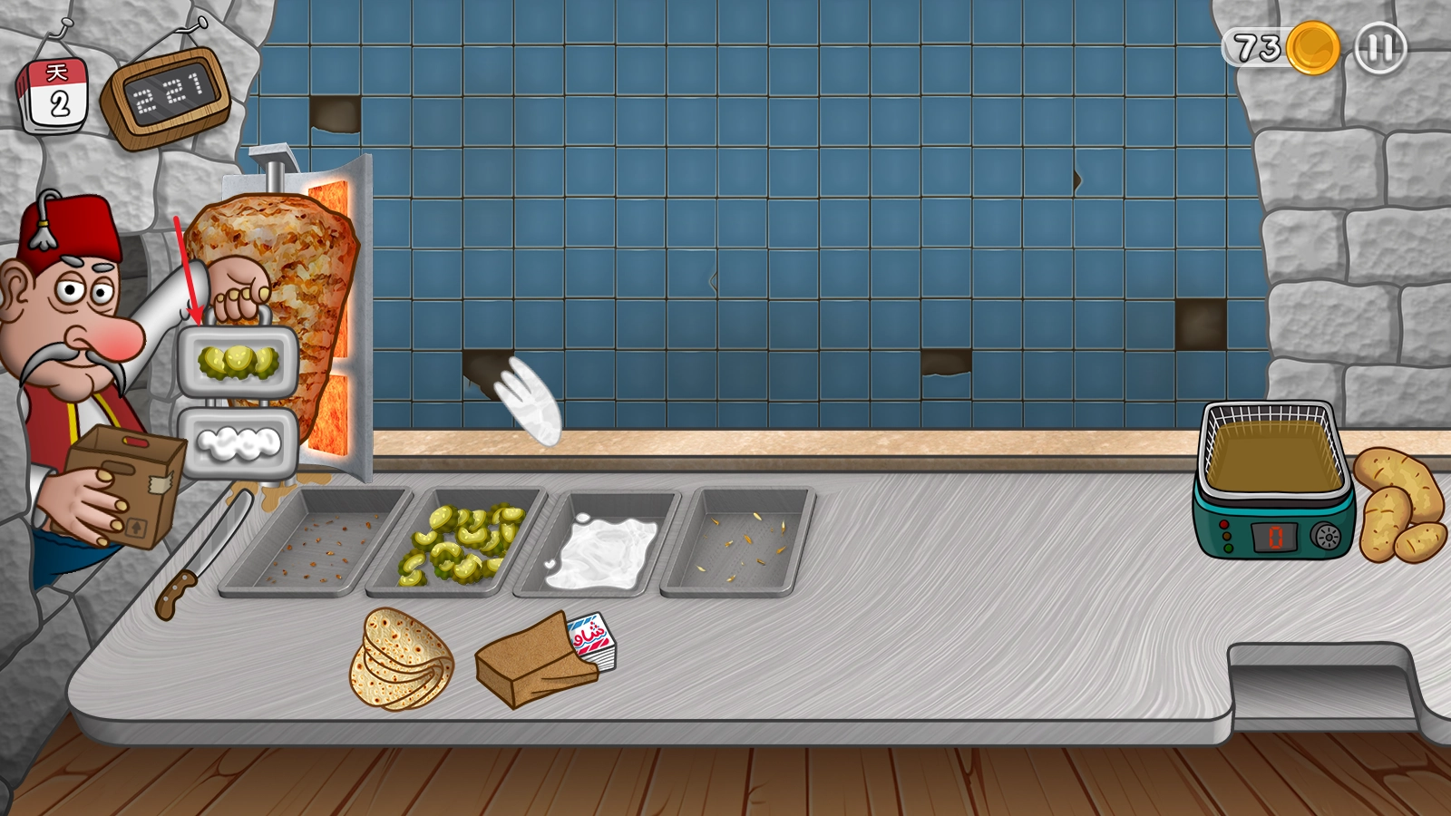 一天的经营开始后,我们先着手准备食材,只需点击服务员,就能添加酸黄瓜和酱料了。