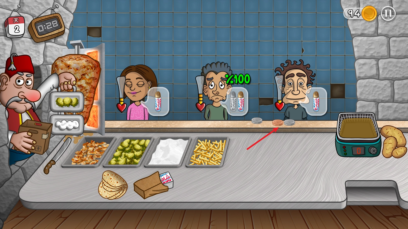 6、把做好的沙威玛递给顾客就可以了,之后顾客会在原地留下金币,点击就能收起来。