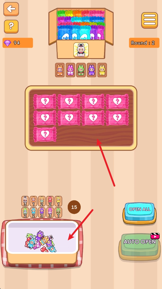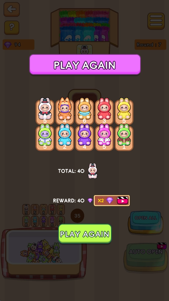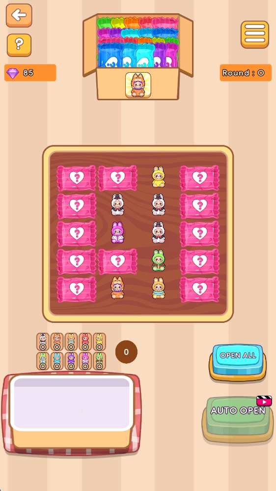 6、进入下一回合后,上方会继续显示可开启的盲盒,之前开到的labubu则会存放在左下角。
