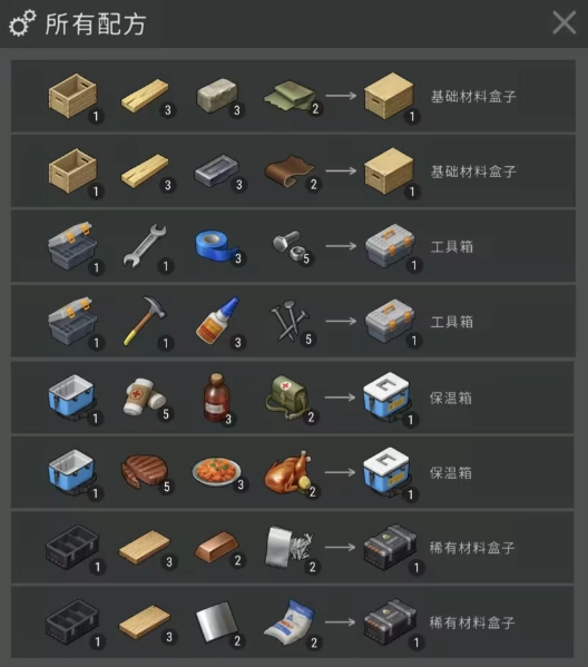 1、第一步需在盒子组装器处完成包装盒的组装,接着携带组装好的包装盒前往打包台进行打包操作,最后到送货终端办理送货事宜。以下是包装盒与打包台的配方说明。