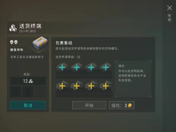 2、送货:蓝色加号的是我们自行打包的货物,黄色加号是需要购买的货物(20金币一个),每次送货至少一个货物(上下两方中哪一个都可以)。此外,你要是选择黄色加号的货物进行派送,建议选择使用2金币,进行投保,较为保险。