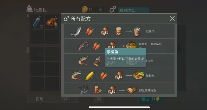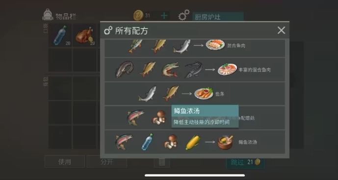 16、鳟鱼浓汤:降低主动技能的冷却时间。