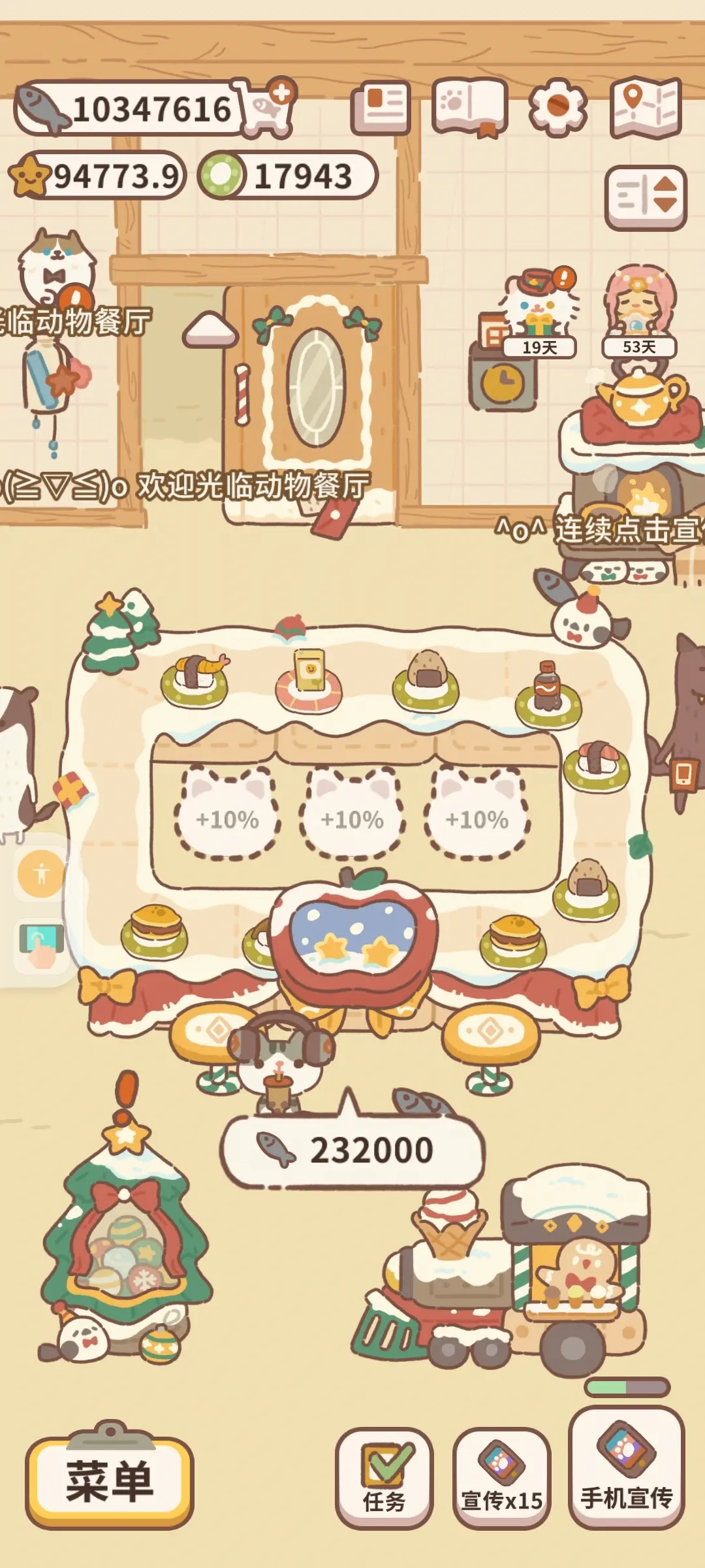 2、当营业额突破900000000小鱼干时,建议前期优先配置小费台(路径:设施—餐厅—小费台),该设施能累积离线收益容量;另外可生产小费的旋转餐台(路径:设施—自助—旋转餐厅)同样支持离线收益容量累加,预计离线6.5小时左右就能收获100万小鱼干。后续可增加自助收入类设施,再通过观看广告获取双倍收益。