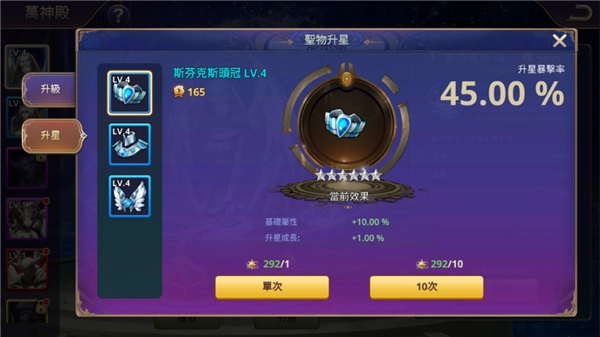 圣物部件能够进行升星操作,该操作所需的材料为星魂石。每一颗星星都被划分为八个阶段,当完成第八个阶段后,圣物部件就可以提升一星。在每个阶段提升时,都会使圣物部件的属性得到增长。在升星的过程中,存在着暴击进度机制,不过随着星级的不断提升,暴击率会慢慢下降,与此同时,升星所需的星魂石数量也会逐渐增加。