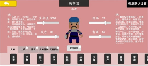 4、开放更多编辑器供玩家自由搭建游戏环境,同时每个武将都具备独特属性,玩家需熟悉各武将的战斗属性。