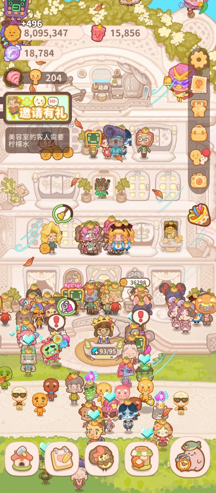 4.游戏里并非只有你孤身一人,还能添加好友一同游玩。解锁不同建筑后,你会获得更多角色,像厨师亨利、能召唤沐浴精灵的女巫泡泡;有友善角色,自然也有反派,比如偷吃饼干的老鼠富贵、会吃掉饼干旅客的大魔王。此外,还有些能带来增益效果的角色,例如财神和隐身小精灵。