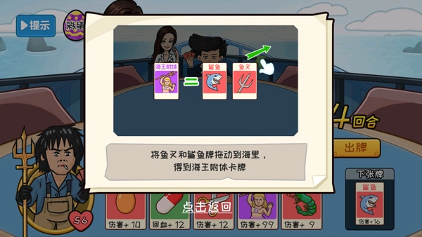 在“夺回秋雅”这一关卡中,我们得把鲨鱼和鱼叉都扔进海里,这样就能获得一张海王卡牌,凭借它就能击败对手了。