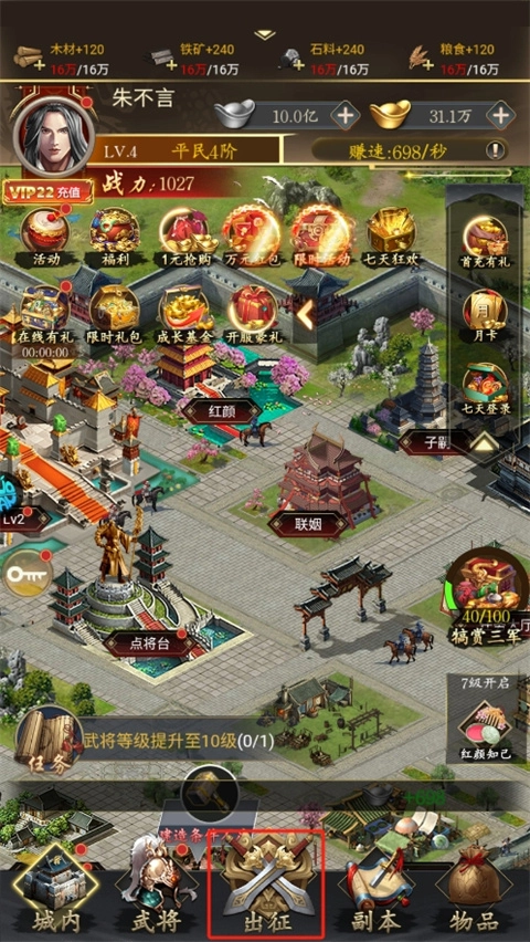 3、进入后你可以点击行军或者一键行军,行军会消耗军费;