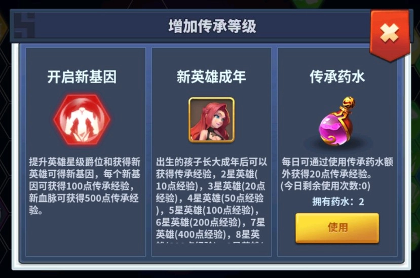 解锁的基因一部分源于传承等级的提升,另一部分则来自英雄自身所携带的。