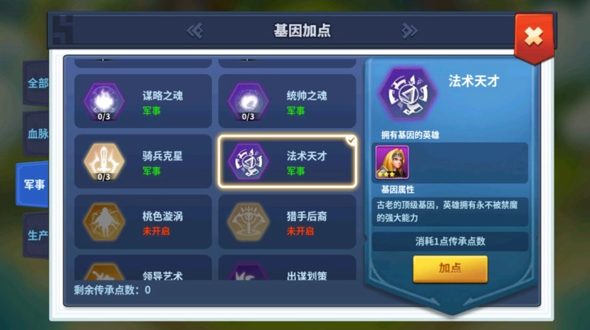 关于传承加点的操作步骤:选择任意一个已解锁的基因,点击对应的加点选项,此时会出现相关的操作界面。