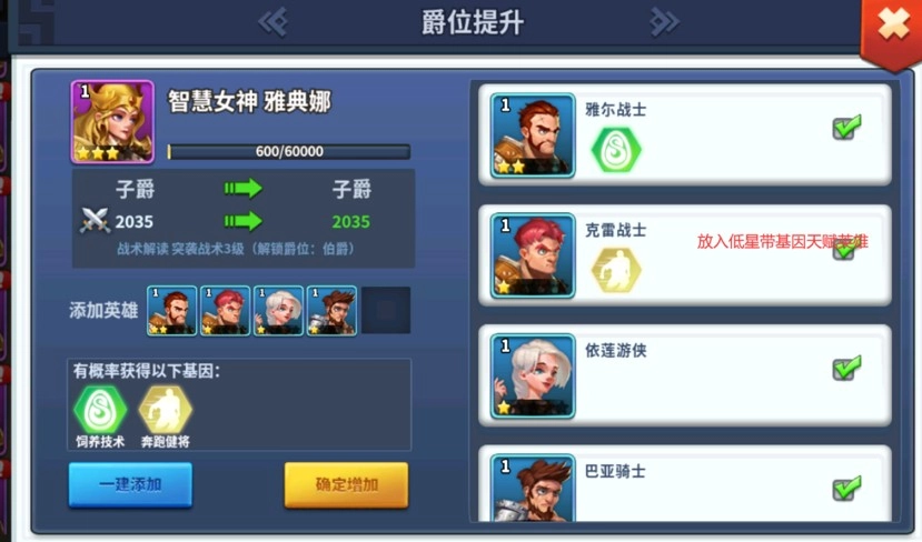 在为英雄提升爵位的过程中,若用于晋升的材料英雄中存在带有基因的个体,那么这些基因就有几率传递给接受晋升的英雄。