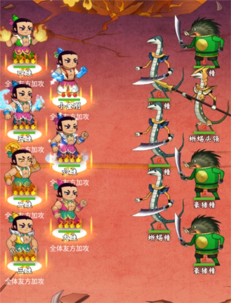 一个好汉三个帮,兄弟间的本领配合是降妖的关键,葫芦兄弟的技能羁绊,给妖精造成巨额伤害,让降妖事半功倍哦!