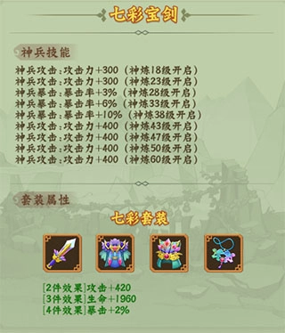 和紫色套装类似,金色套装同样划分为输出类与防御类,对应的是山神套装和七彩套装。这两套的武器,都是除小蝴蝶、小金刚之外,顶尖输出角色与坦克角色的缘分武器。建议获取后优先给阵容里的主力装备,以此增强主力角色的实力。
