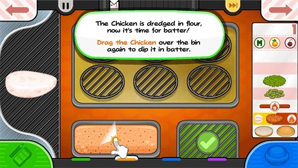 【面包、面糊与油炸】用各式各样的面包屑和面糊给鸡肉裹上外衣,再把鸡肉放进油炸锅烹炸到恰到好处!Papa Louie 想要在竞争里占据上风,所以说不定过些时候,他就会开始推出鸡肉之外的其他可油炸食物啦!