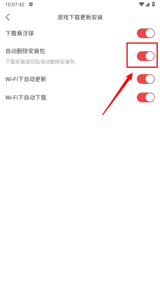 如图所示,只需开启自动删除安装包的开关,这样游戏安装完成后,对应的安装包就会被自动清除。