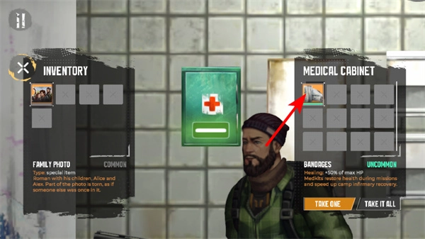 进入医疗柜界面后,你可以选择领取医疗物资,像绷带这类物品,既能恢复生命值,又能提升营地的医疗恢复效率,借助这些医疗物资可以更好地保障角色的生存状态。