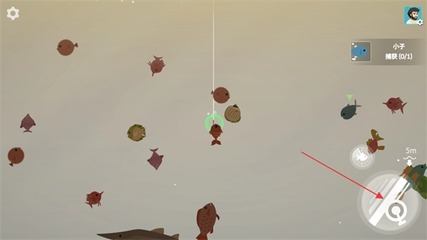 当发现有鱼儿咬钩时,立刻点击右下角的按钮来收杆。