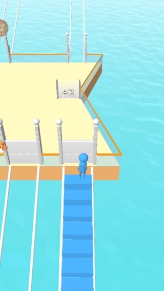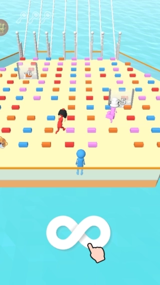 1、点击进入游戏后,操纵角色收集和自身颜色一致的砖块,用这些砖块搭建云梯,从而向上挑战关卡。