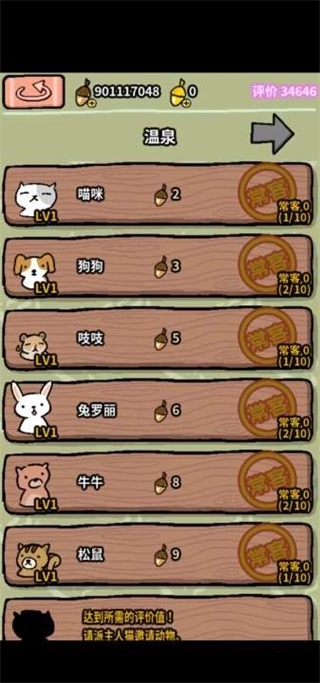 3、用赚取的橡果持续扩建和升级温泉馆,提高声誉来吸引更多不同种类的动物光临。