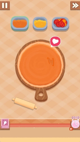 2、用擀面杖在屏幕上自由滑动,就能快速做出完整的面饼,为接下来制作披萨打好基础。