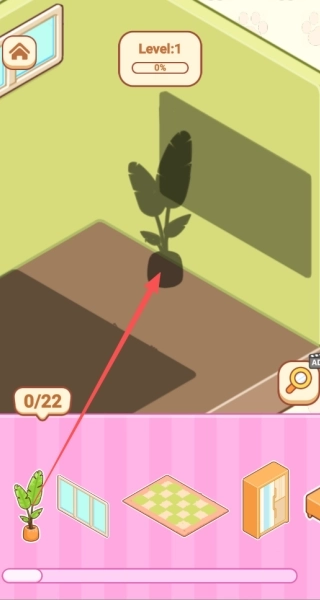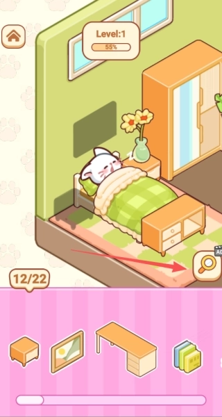 4、要是不清楚物品该放置的位置,点击屏幕侧边的放大镜按钮就能得到提示,通过提示可以快速找到物品位置,让装饰过程顺利进行下去。