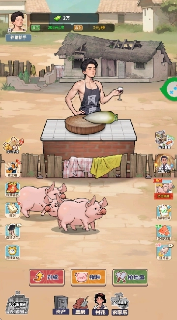 1、进入游戏后持续点击屏幕就能切菜喂猪,系统会自动产生养猪带来的收益。