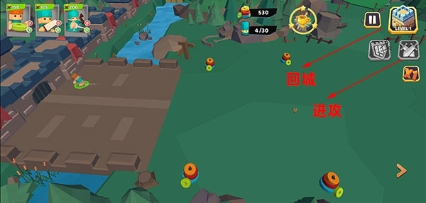 5、备战完成后,点击左侧的进攻按钮,要是敌方火力过于猛烈,可选择回城进行防御。