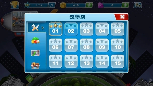 这是一款闯关类游戏,你可以挑选想挑战的关卡开启厨师养成之旅。游戏里每个关卡的任务目标各不相同,只要合理规划厨师完成挑战,就能拿到三星评价,还有机会解锁新餐具和其他功能呢!