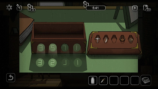 6、窗下柜子的饰品盒,需按照《末世》里的人物顺序,把【十字架】【狼牙】【宝剑吊坠】【戒指】【毒蛇饰品】依次放进凹槽中。完成后可获得密码:5317(如图↓)。其中【宝剑吊坠】能够收回至物品栏。