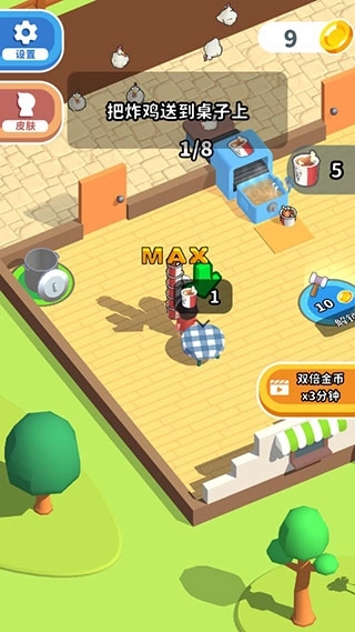 5、稍等片刻炸鸡就做好啦,走到炸鸡所在的位置,就会自动拿起炸鸡,我们把炸鸡放到桌子上,等客人吃完炸鸡后,桌子旁边就会出现金币哦。