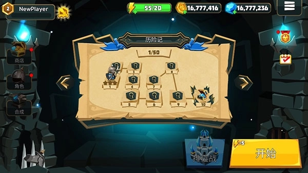 1、安装《德雷克与陷阱》游戏,进入游戏后即可看到拥有一千多万钻石和金币,首次打开还有额外奖励可领取。点击首页中间的关卡入口,再点击“开始”按钮就能进入关卡游玩了。
