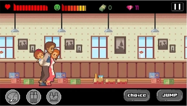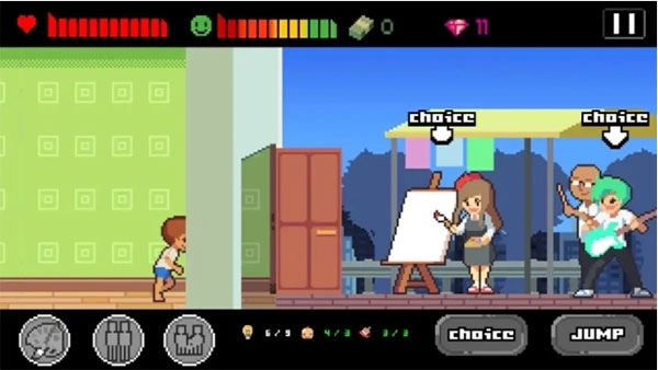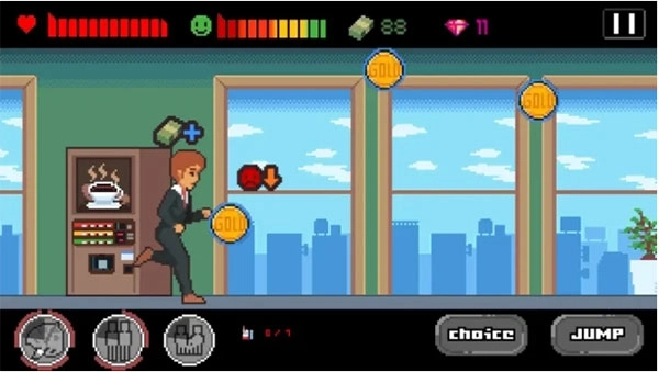 2、人生游戏采用跑酷的形式来进行游戏,过程当中可以通过跳跃来收集兴趣爱好的成长,或是工作中的晋升机会等等,还可以通过点击事件来改变人生的走向;