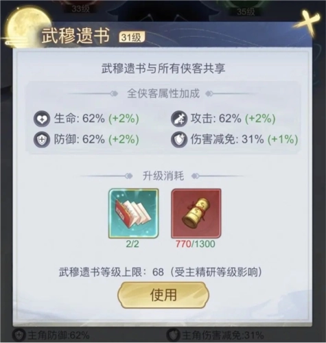 提升《武穆遗书》的等级能够带来极高的战力加成,所需消耗的材料是《武穆遗书》本身和精进点。在这两种材料里,《武穆遗书》的获取难度比较大,而精进点获取起来则要容易不少。
