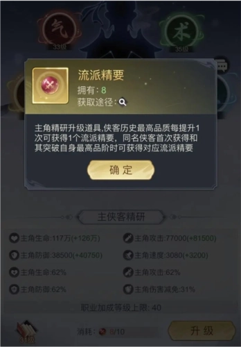 要提升主侠客的精研等级,需消耗足够数量的流派精要。【流派精要获取途径】:每次提升侠客品质,都能得到1个流派精要。