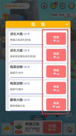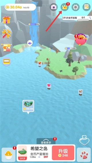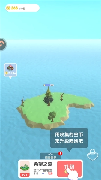 5、当收集到足够的爱心后,就能对陆地进行升级操作,这样不仅能提升金币的产出量,还能让陆地的规模得到扩大。