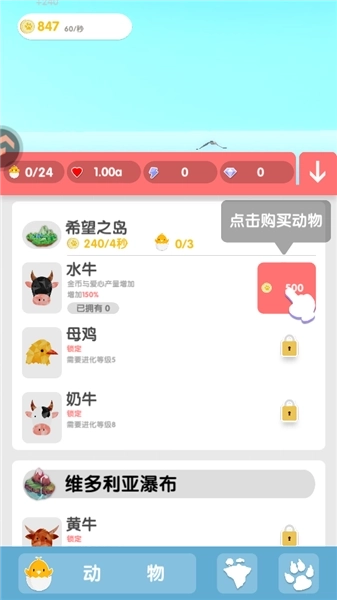 3、当积累了足够的金币后,我们就能购买动物,这样不仅能提升岛屿的金币与爱心产出量,还能让岛屿变得更有生机。