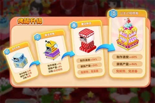2、升级烤箱的技巧和角色升级是一个道理:烤箱升级时,里面的蛋糕会立刻烤好,所以升级前一定要把任务里耗时最久的蛋糕放进烤箱,这样能让任务难度大幅降低。(新手是不是都在吐槽,有的蛋糕烤十几个小时才卖一块,太坑了!)把角色升级和烤箱升级搭配好,就能搞定大部分让你卡壳的棘手任务。