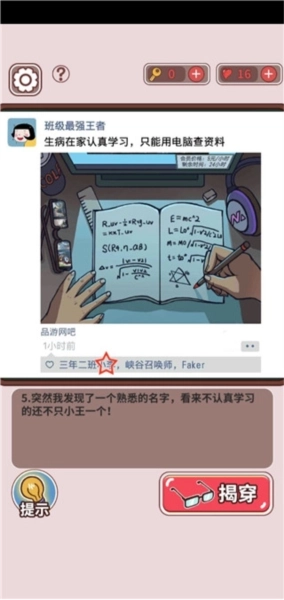 第五关的操作步骤如下:首先点击品游网吧,接着点击电脑上显示的会员时间,然后点击桌子上的眼镜镜面,再点击男孩手上的笔头,最后点击三年级二班小李所点的赞。