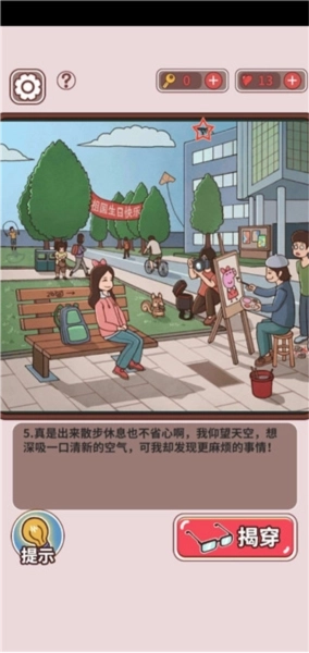 第十二关的通关步骤如下:首先点击站在最后面手拉手的两位同学,接着点击穿绿色衣服同学背上的伞,然后点击撑着五角星图案伞的那对男女同学脚上的情侣鞋,再点击脚印,最后点击操场那边女生的裤腿,这样就能过关了。