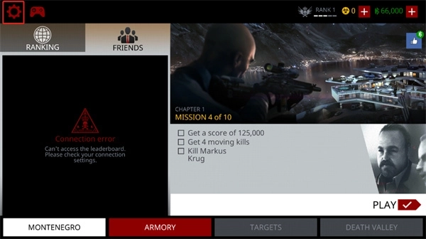1、双击启动代号47狙击游戏,接着点击界面左上角的齿轮图标;