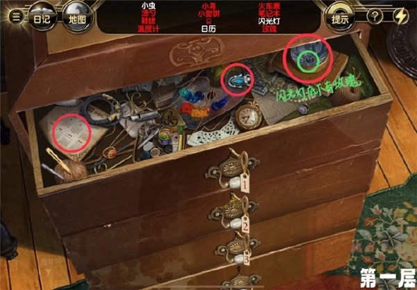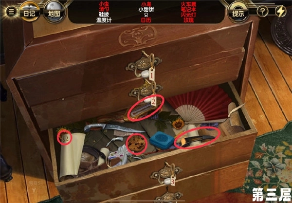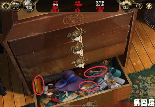 1.就像下面图片里三个红圈标记的那样:第一个红圈里是抽屉内的报纸,第二个是类似发簪的物件,第三个则是闪光灯下方的玫瑰。