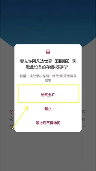 ①打开已安装完成的游戏后,会弹出安装器界面,此时会出现“储存权限”的提示,点击【始终允许】即可。