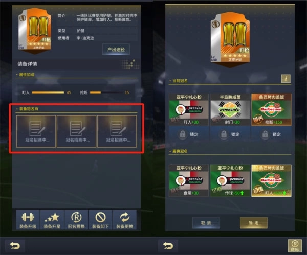 号码调整到位后,其他装备的提升也得跟上!艾特足球新版本里,装备冠名系统惊喜上线啦。点击装备就能找到冠名系统的入口,你可以用一些欧元和精华之证来刷新冠名,从中挑选适合自己的。消耗的数量会随着刷新次数变多而增加,不过到了新的一天就会重置回初始状态。