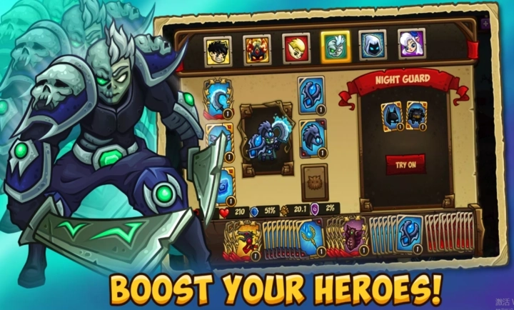 3、防御英雄须参与王国围攻、塔防战与锦标赛,完成突击任务,开采资源,收集并升级CCG卡牌,还要和国王麾下的帝国战士一同训练。