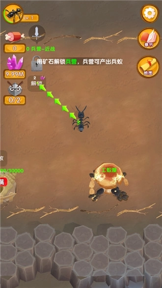 1、在本站完成安装后启动游戏,第一步需要将蚂蚁拖动到“解锁”字样处,通过矿石解锁兵营,解锁后的兵营能够生产兵蚁;
