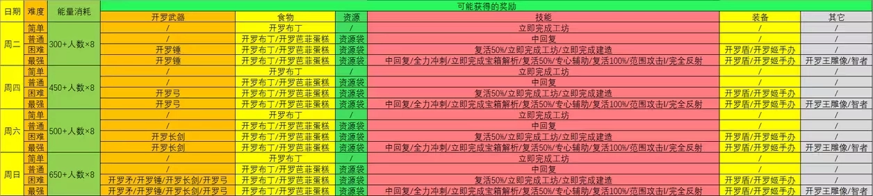 接下来要介绍的是开罗房间的挑战奖励。挑战难度越高,消耗的能量就越多,相应地,能获得的奖励也可能更丰厚。具体的奖励内容如下: