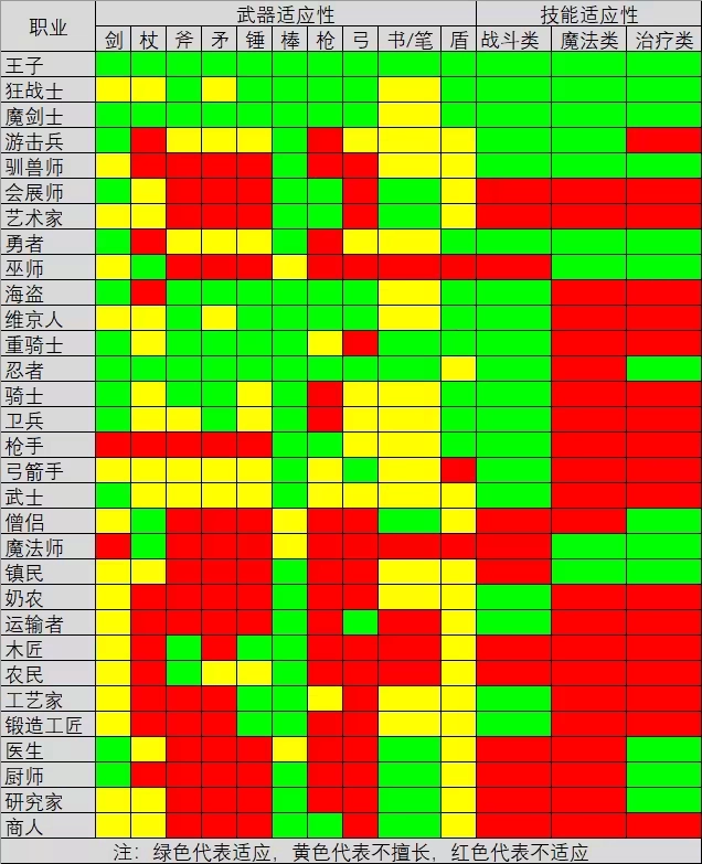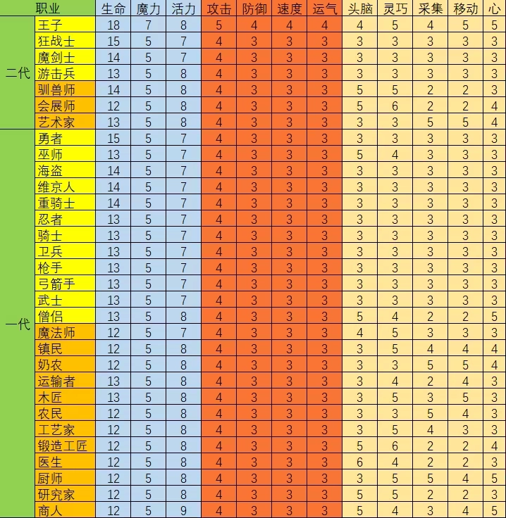 从这张图能看出来,战斗方面最适配的首选是王子,接着是勇者和狂战士;法师角色的最佳人选并非魔法师或巫师,反而是驯兽师(毕竟魔力与头脑值在这方面比较关键);外出调查任务最适合交给镇民或者奶农去做(因为心的数值会影响调查的成功概率)。
