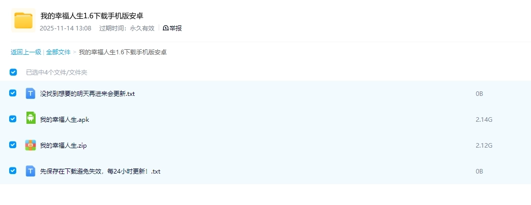温馨提示:由于我的幸福人生安卓最新版安装包体积较大,本页面提供的是网盘链接,该链接会实时更新至最新版本,欢迎大家下载安装体验!