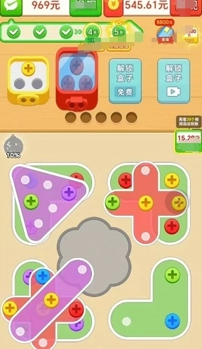 任务福利里的“五福临门”是个解锁螺丝的小游戏,新人玩上几关就能领取5个小红包。