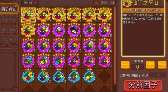 关于因子仅保留牙和邪,所有的牙与邪都需保留,其余因子全部分解。当攒齐6个同属性的牙或邪后,就能和大佬们组队刷副本——平均每轮牙能产出12至18个橙色碎片,邪的碎片获取则要看运气;牙的碎片因是最后一轮BOSS掉落,还可以挂机刷取。